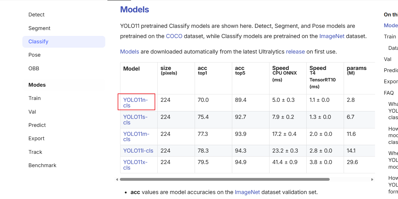 由于我们识别是通过分类基础模型训练,所以我们需要到官网下载分类基础模型。地址:Image Classification - Ultralytics YOLO Docs
