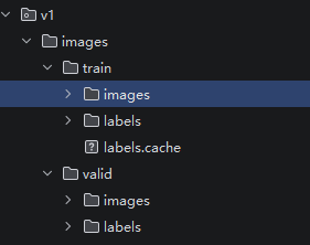 convert_json_to_yolo(f"{labels_dir_path}/"+i, f"{input_dir_path}/"+i.replace("json","txt"))现在我们需要创建一个项目文件夹作为根目录,如我这里命名为v1,然后在v1文件夹下创建一个images文件夹,其下分别创建train训练集文件夹和valid验证集文件夹。然后把图片和txt文件分别放到训练集和验证集文件夹下的images和lables文件夹下。具体如下所示:
