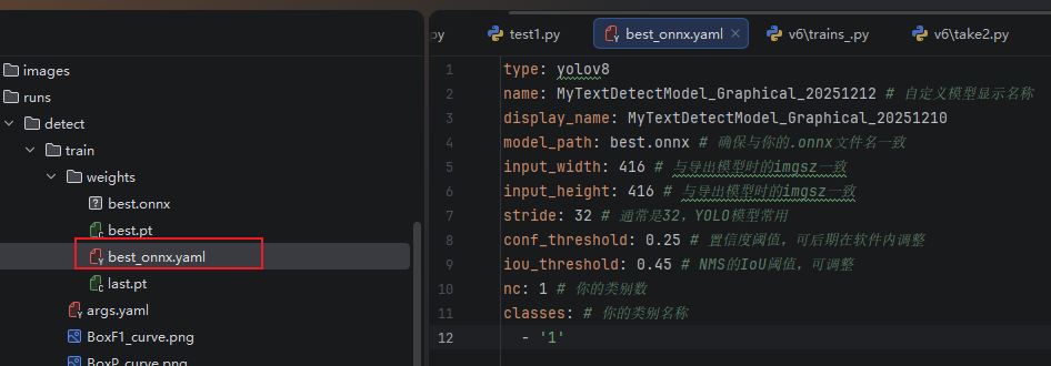 执行之后会在best.pt相同目录下生成一个onnx模型,这样就可以自己调用了。如果想适配到X-AnyLabeling加载本地模型,自动识别相同类型验证码,则还需要在onnx模型相同目录下配置一个yaml文件。如下: